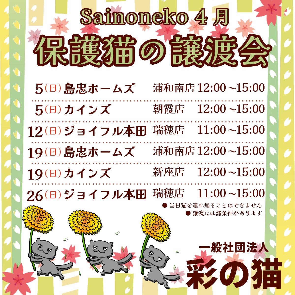 - 彩の猫は公益財団法人どうぶつ基金の「さくらねこ無料不妊手術事業」に参加しているさいたま市動物愛護ふれあいセンターと協働して多頭飼育救済を行いました。どうぶつ基金が発行する「さくらねこTNR無料不妊手術チケット」を使用し、不妊手術費用、ワクチン、ノミダニ駆除薬については全額どうぶつ基金が負担しました。